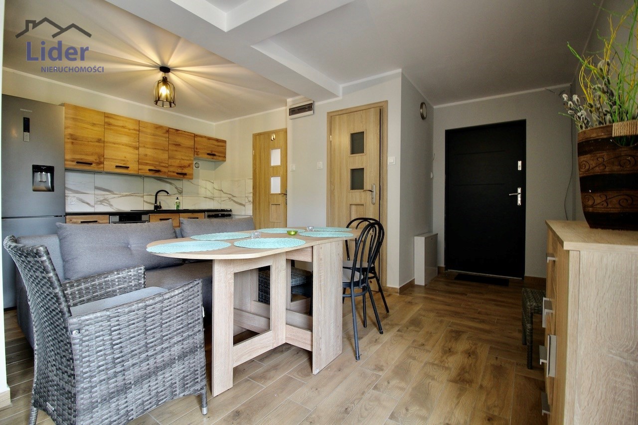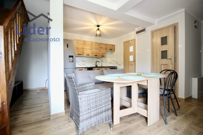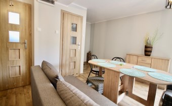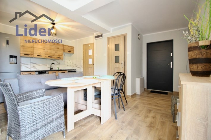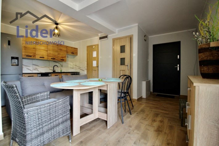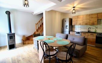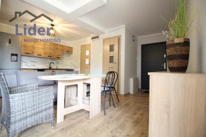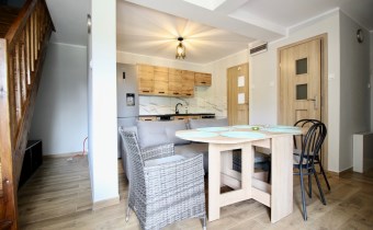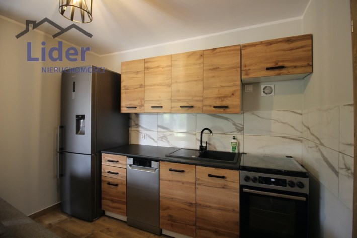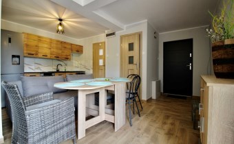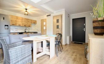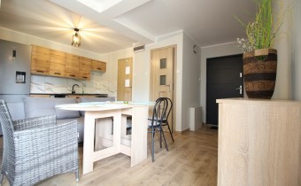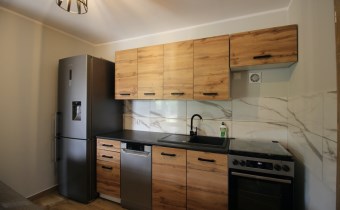 Kuchnia w pełni wyposażona (meble, lodówka z pojemnikiem na wodę, zmywarka, kuchenka elektryczno-gazowa)